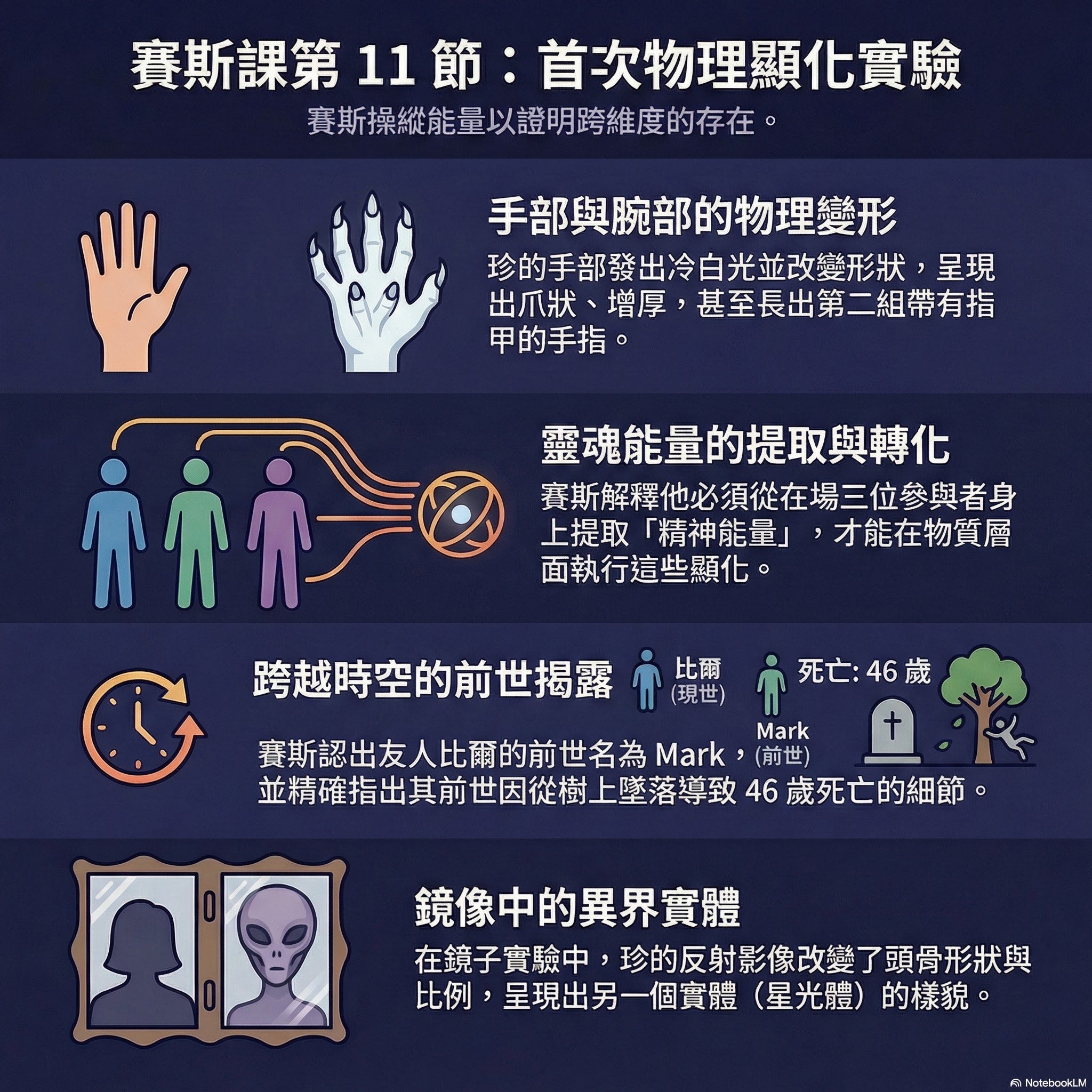 這場「非預約」的聚會展示了意識對物質的強大操縱力。賽斯透過珍的手展示了冷光、物理變形甚至局部物化。雖然賽斯嘴上說這些是「小把戲」,但他其實是在示範能量如何轉化。