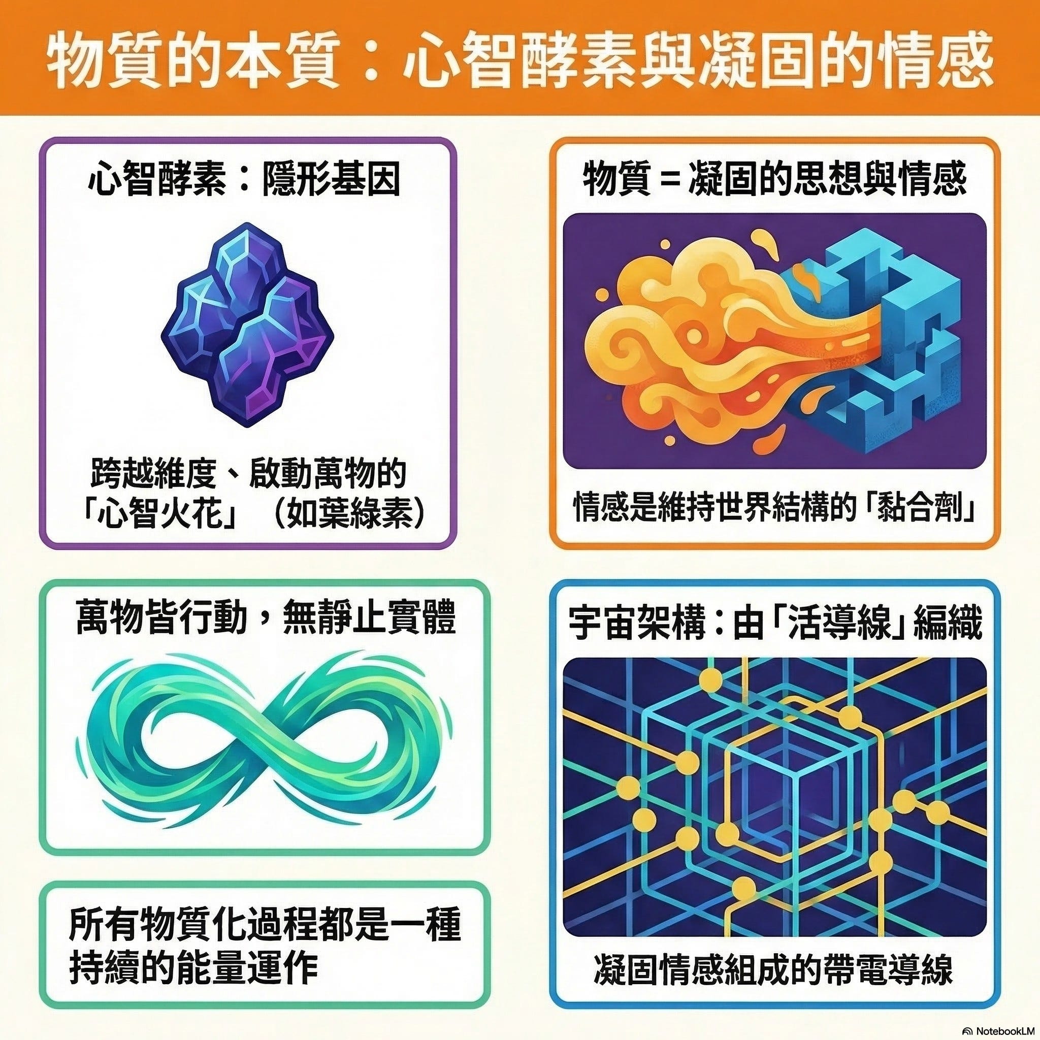 核心語句: 「精神酵素不僅在物質世界中產生行動,而且它們本身就是行動。」(Mental enzymes not only produce action in the material world but become the action.)