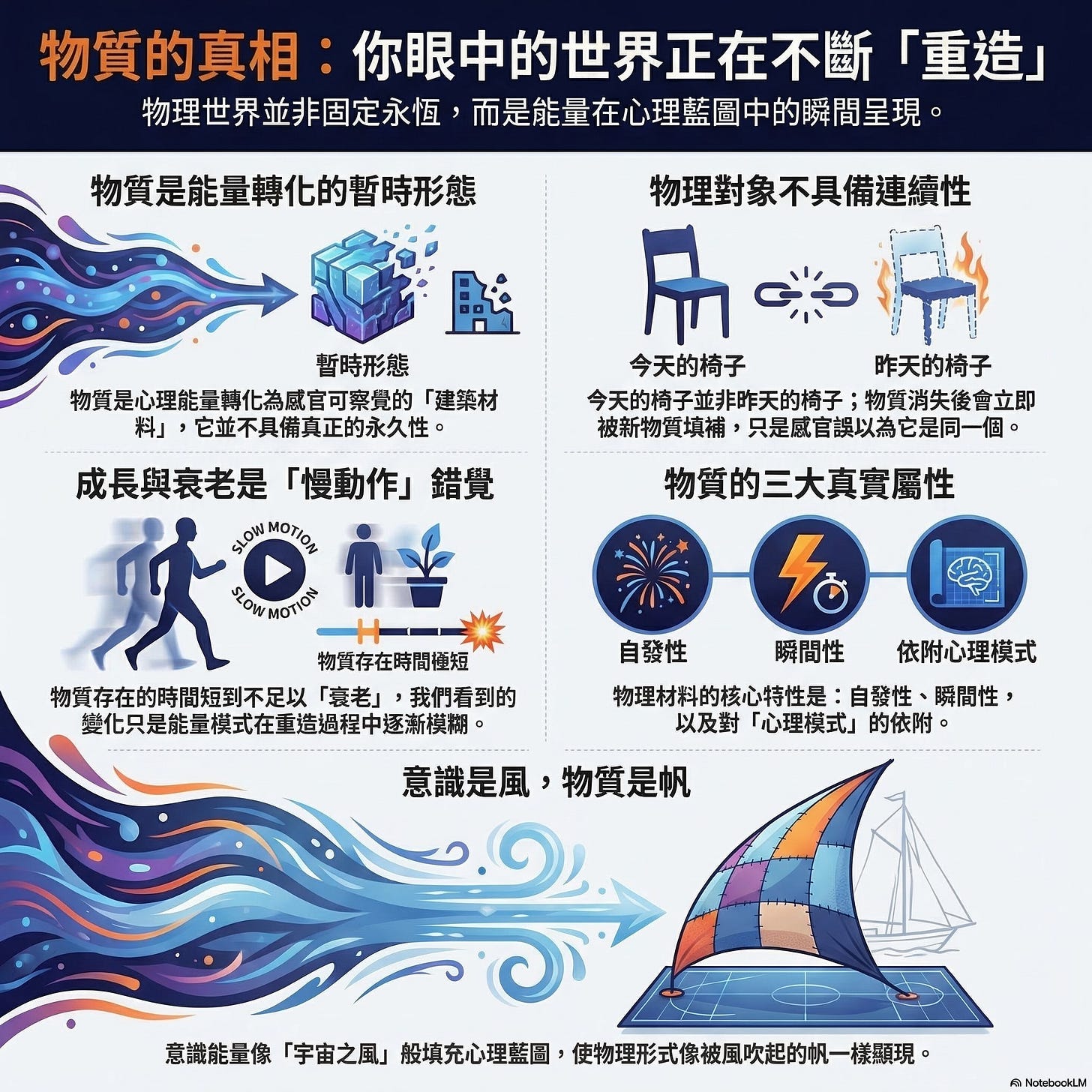 帆船理論: 就像風吹進帆布使其鼓起一樣,能量填充了模式,使物質看起來堅硬且永久。但組成物質的「風」每一秒都在變換。