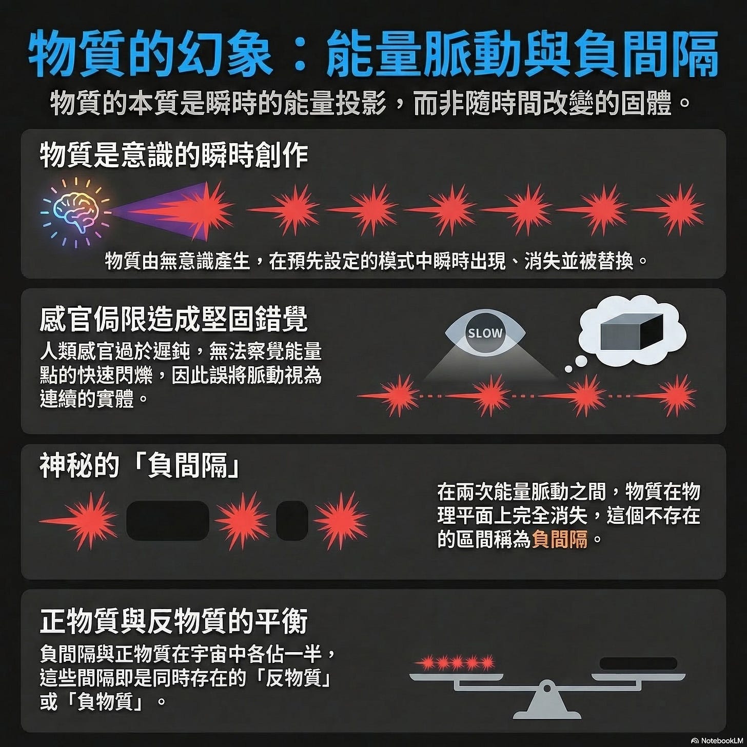 這部分真的很有趣。賽斯提出了一個概念,叫做「負間隔」(Negative Intervals)。簡單來說,我們的世界並不是「一直存在」的。
