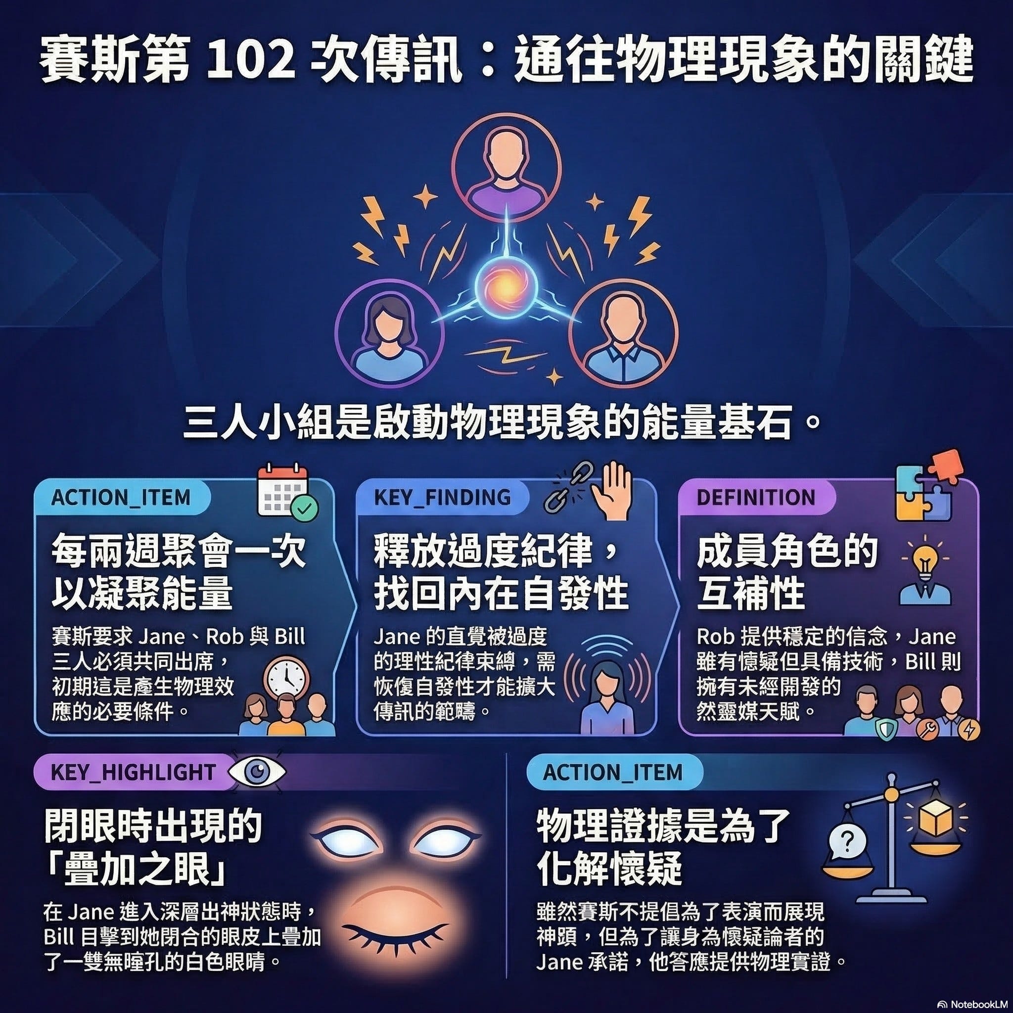 懷疑論者的「物理大禮包」: 賽斯一開場就很大方(也很幽默)地說,既然珍這個「著名的懷疑論者」想要看特效,那他就破例露兩手。但這是有條件的:約瑟、魯伯和馬克這「鐵三角」必須每兩週聚會一次,透過紀律與奉獻來交換這些現象。