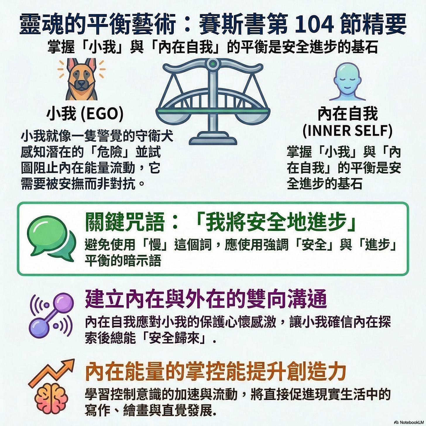 關鍵咒語「我將安全地進步」:賽斯特別指導了暗示語的選擇。不要用「慢慢來」,因為「慢」只是中性的拖延,並不代表安全。正確的咒語是:「我將安全地進步(I will progress safely)」。這能讓自我的焦慮降到最低,讓它知道內在自我也會心存感激,並且一定會「平安降落」。