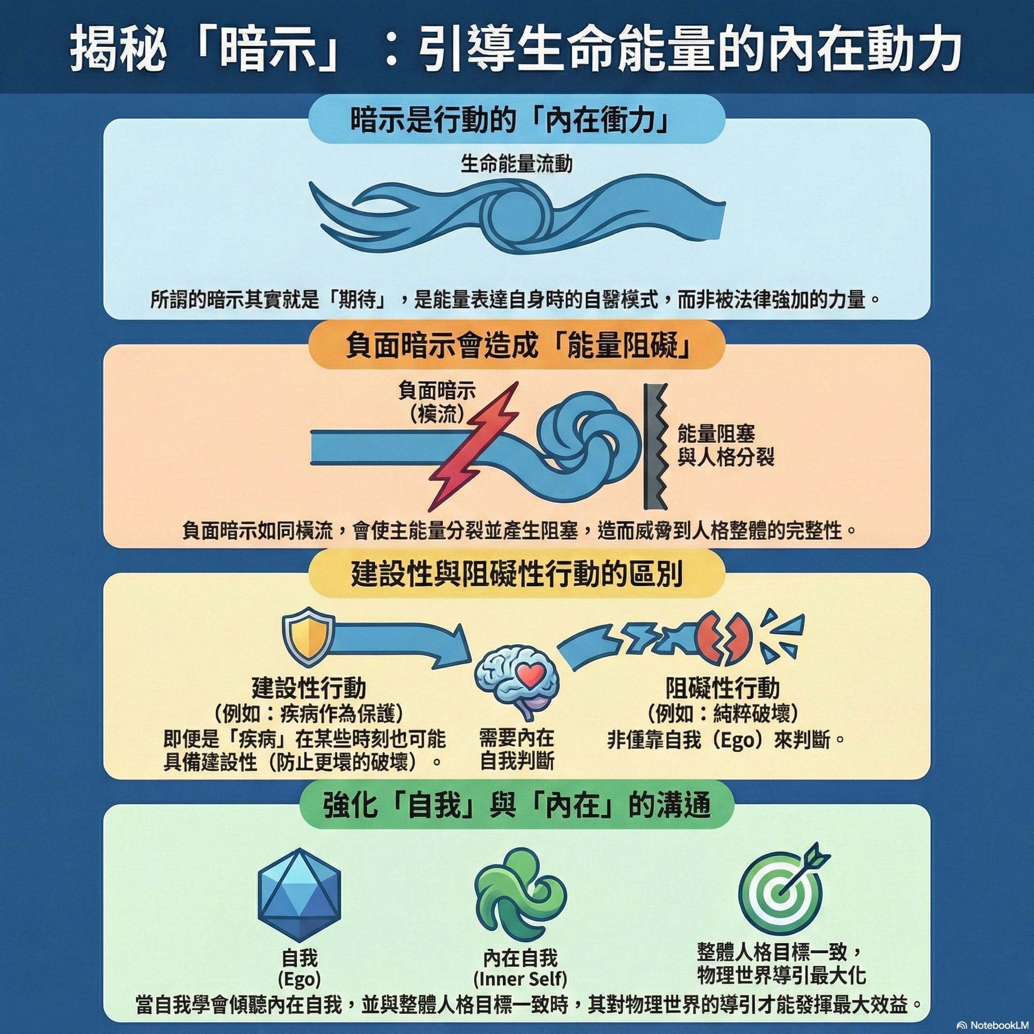 「負面暗示通常是阻礙性的行動……它們像逆流一樣運作,設置阻礙,並通過將主要能量分散到幾個不同的方向來阻礙它。」