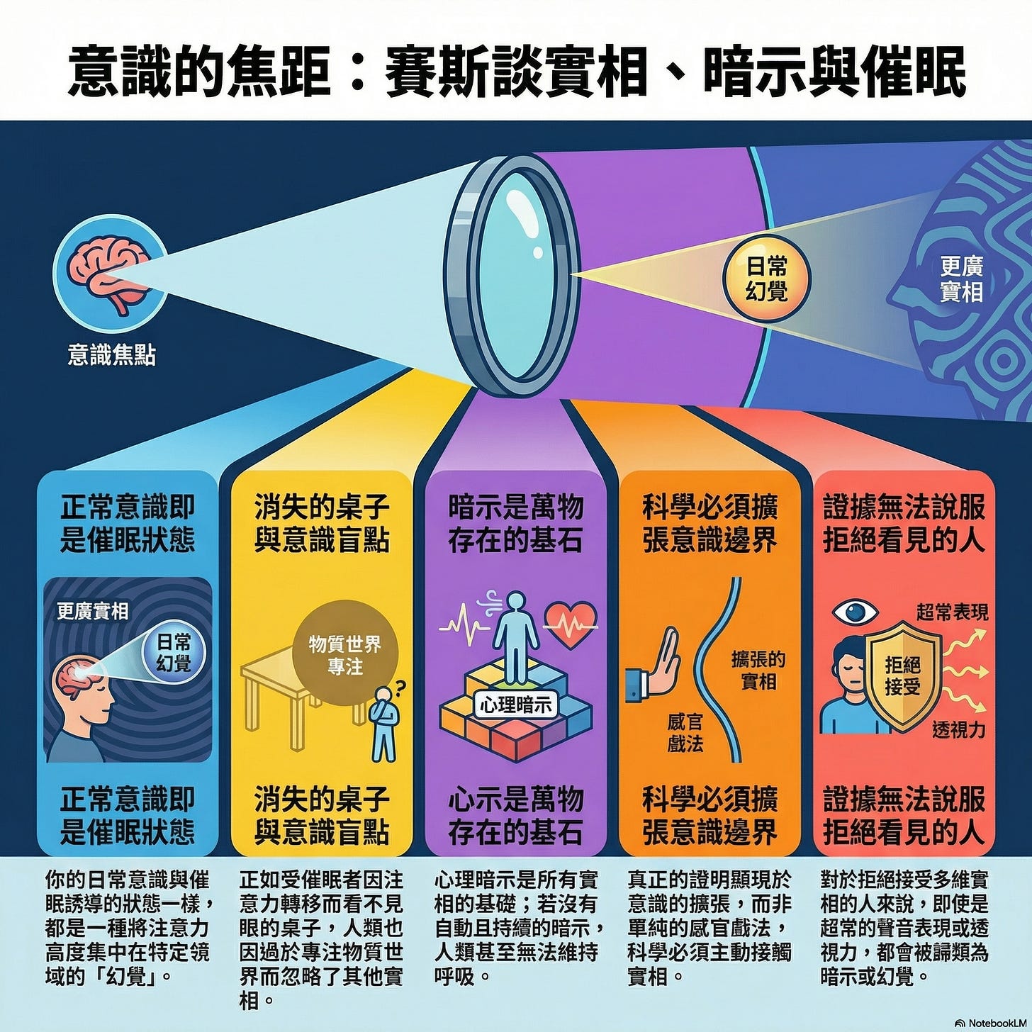 消失的桌子: 賽斯用了一個超 chill 的比喻:如果一個人在恍惚中被告知桌子不存在,那即便桌子就在他面前,他也看不見。這就是科學界的困境——科學家們拒絕擴展意識,卻要求看見那些他們「聚焦之外」的證據。