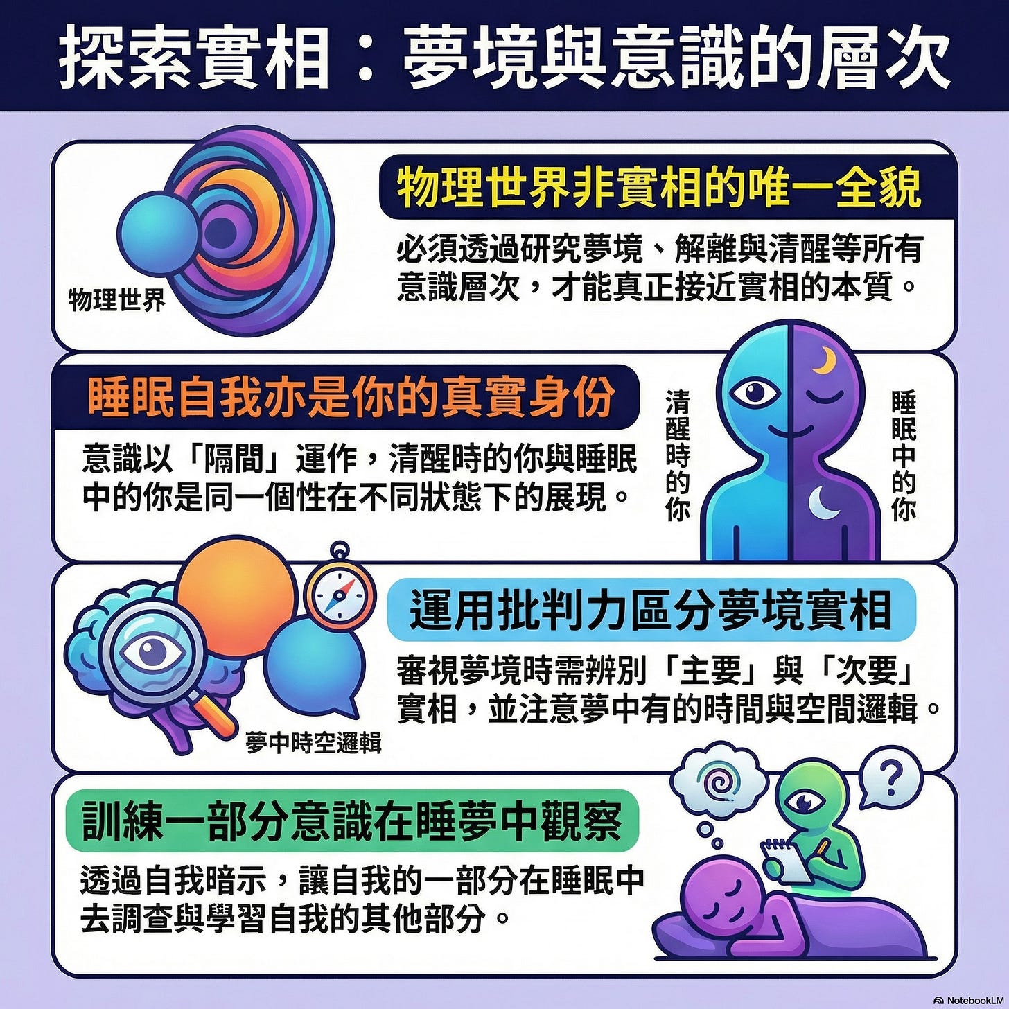 賽斯在這一節中給出了關於夢境實驗的重要指導,他強調我們必須動用「批判性能力」和「智慧」來區分夢中的現實: