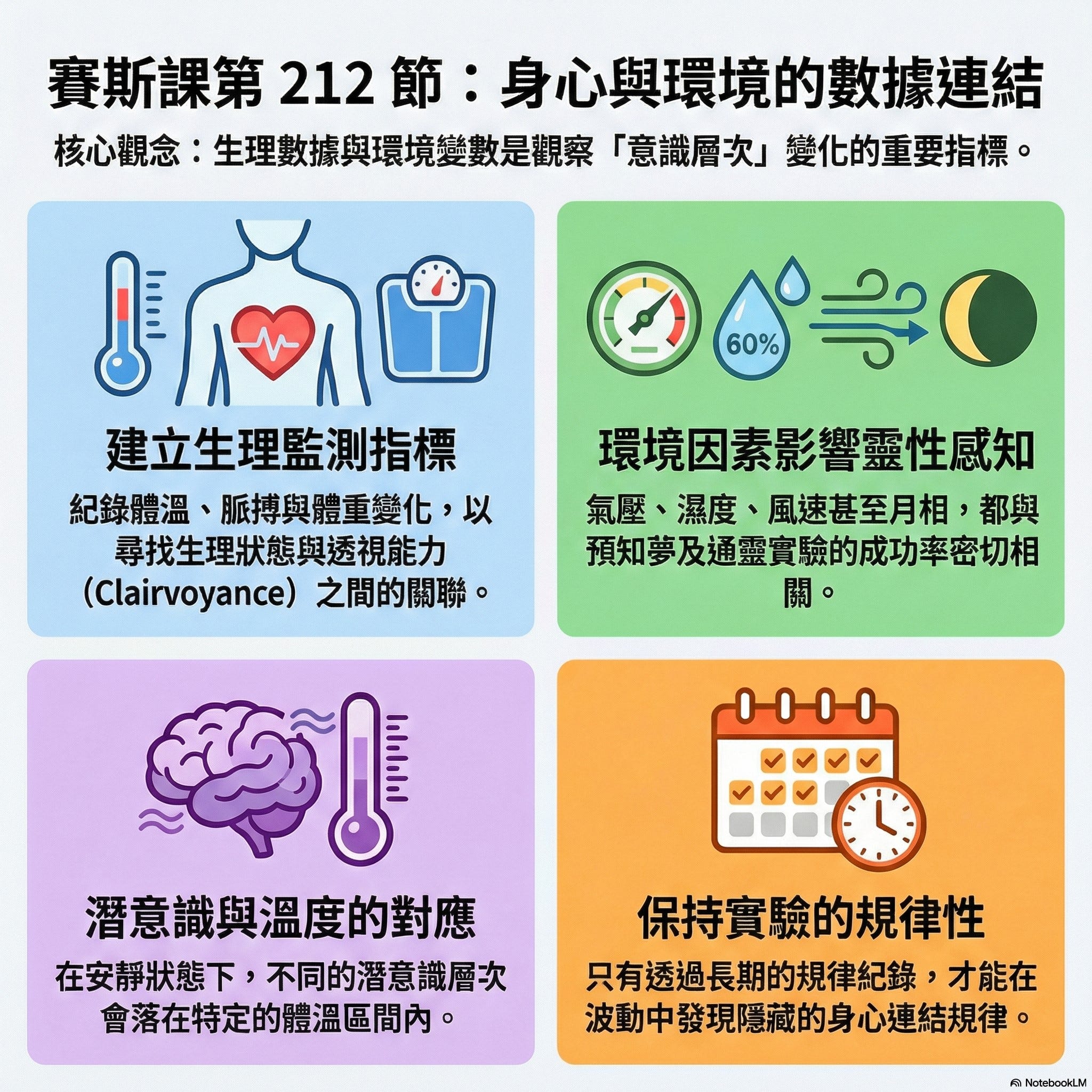 層次與溫度: 賽斯指出,除了少數情況外,潛意識的不同層次其實對應著特定的溫度範圍。這聽起來就像是你的大腦裡裝了幾台不同溫度的冰箱。
