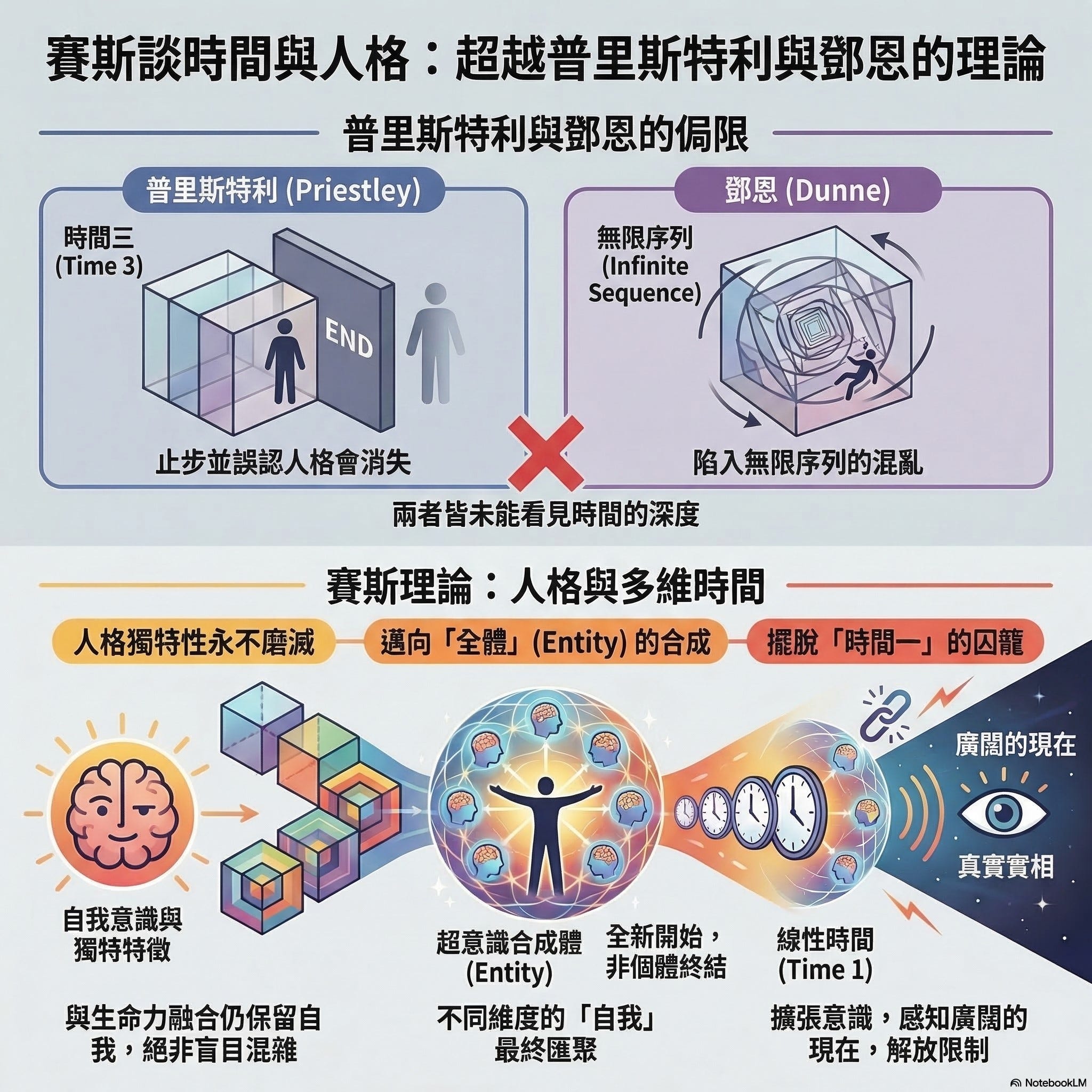 賽斯對這兩位思想家(普利斯特里和鄧恩)的理論給出了一些非常有意思的評價。如果你覺得時間只是「過去、現在、未來」這麼簡單,那你就太天真了!