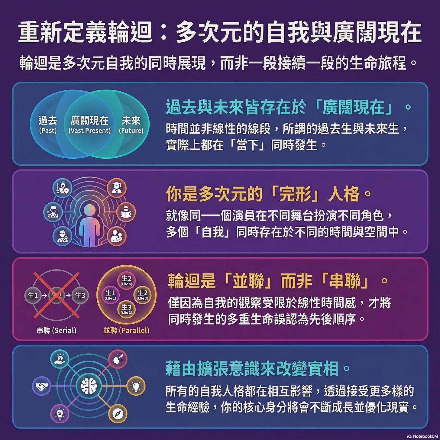 轉世不是「排隊演戲」,是「同步開演」: 你以為轉世是一輩子過完再換下一輩子?賽斯說:錯!因為時間是同時的,所以你的那些所謂的「前世」和「後世」,其實是你的「內在身份」同時演出的不同角色。