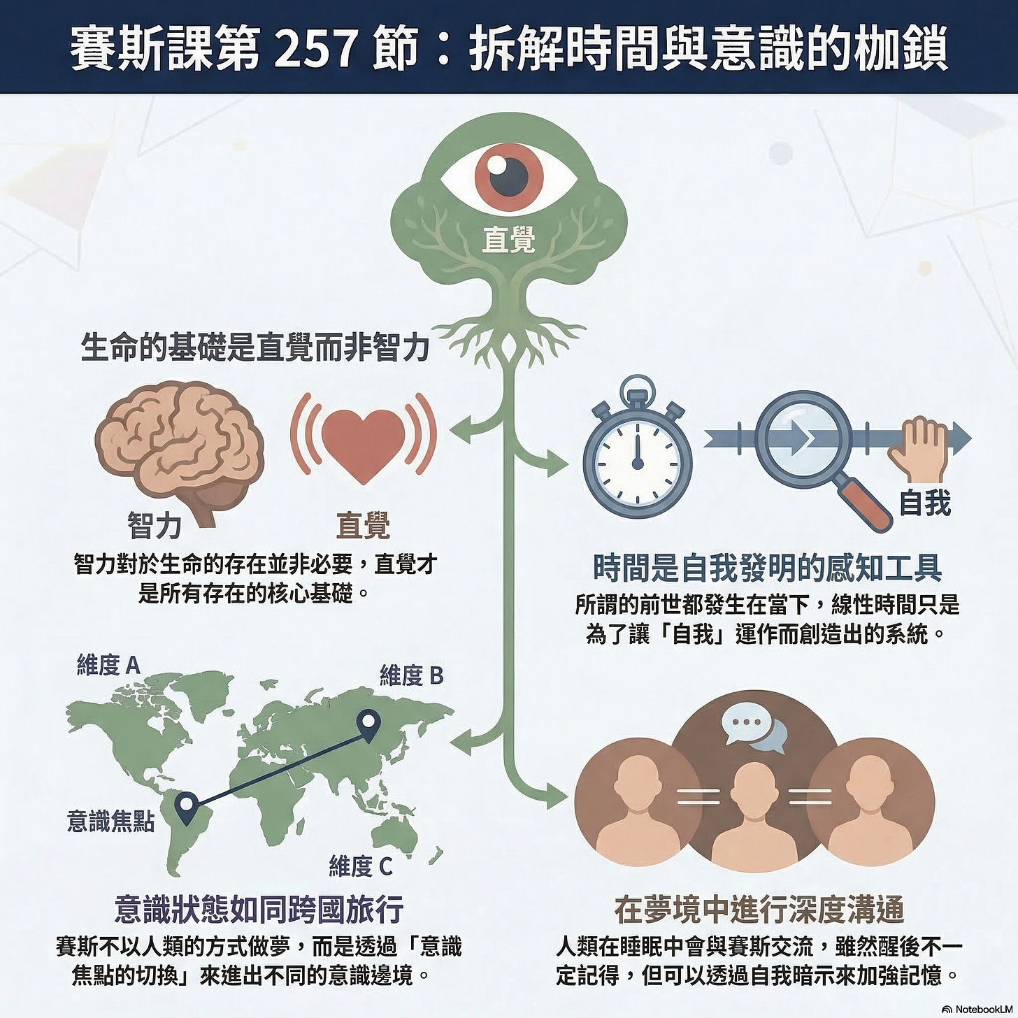 理智的非必要性:賽斯提醒我們,生命的本質是直覺性的。他提到:「顯然,理智對於生命而言並非必要。如你所知,所有的存在都是當下。你所謂的過去世其實發生在現在。你只是發明了一種連續的時間系統,作為自我感知的載體,而它僅在那個層次上運作。」