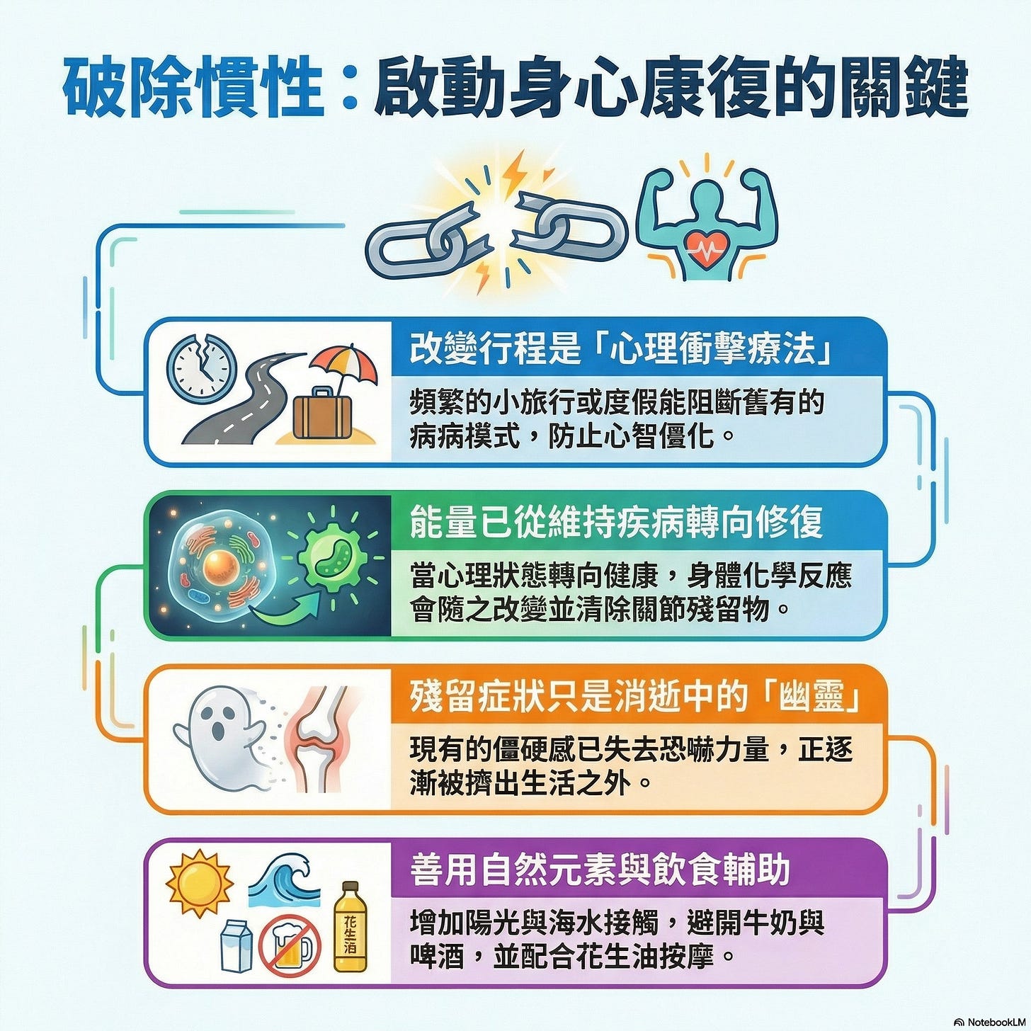 心理與身體的時差: 心理狀態可以瞬間改善,但在實體系統中,生理表現往往會有個「滯後」(lag)。就像你已經轉念了,但身體還在下載更新檔。