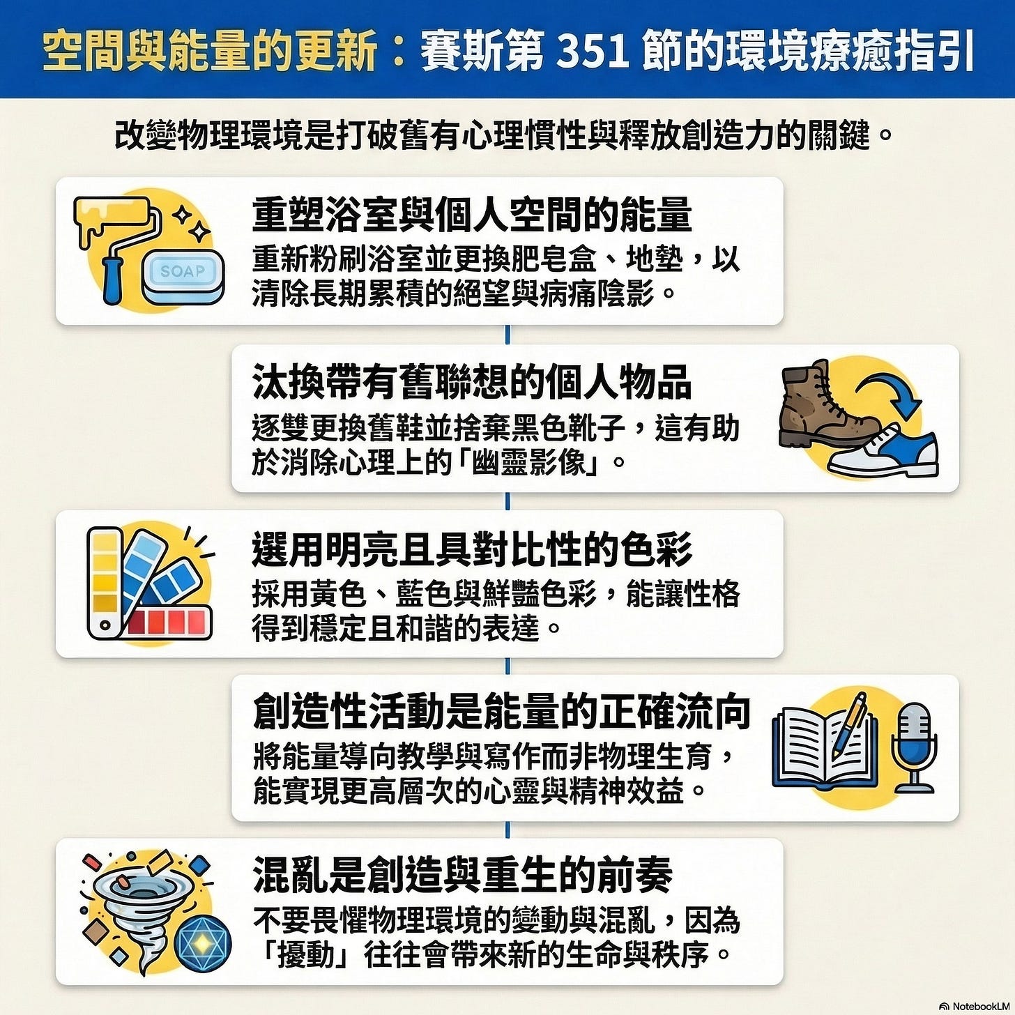 這一節課提醒我們,我們居住的空間、穿的鞋子,甚至我們沙拉裡加的油,都與我們的能量狀態息息相關。如果你覺得生活卡住了,或許可以從刷漆換顏色開始!